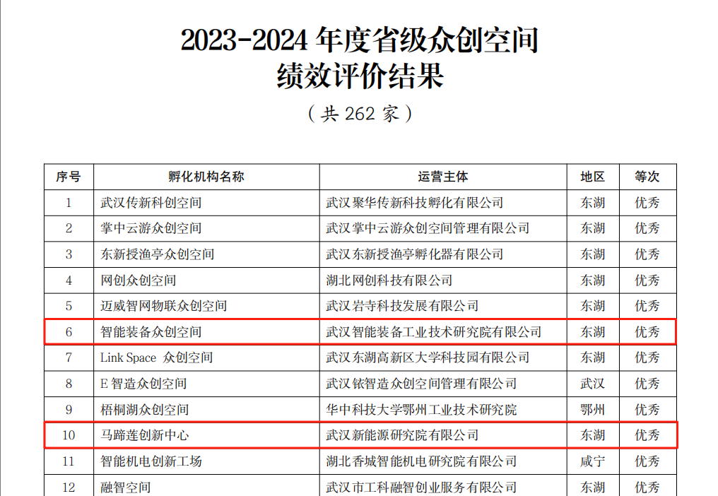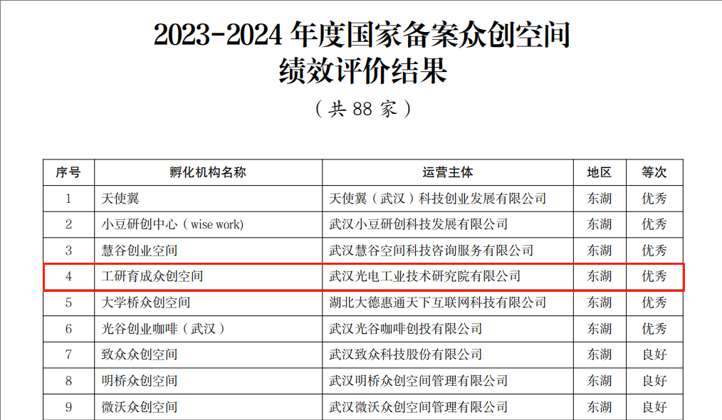 在国家级科技企业孵化器(含7家国家专业化众创空间)绩效评价中,,,,,,武汉光谷生物医药孵化器、武汉光电工研科技企业孵化器、武汉新能源科技企业孵化器、光电显示国家专业化众创空间、智能制造装备国家专业化众创空间、新能源国家专业化众创空间均获评“优异”。。。